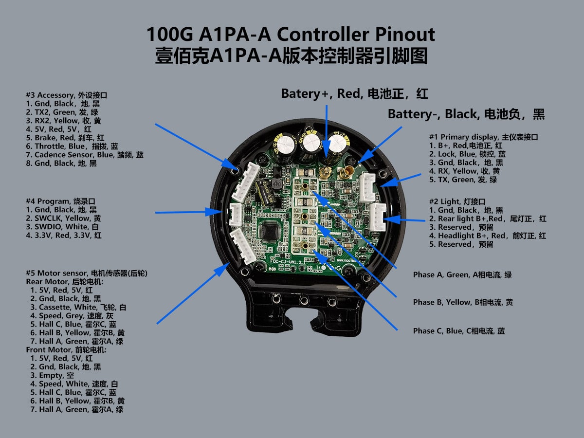 | For A1PA-A/B controllers: remove the battery’s 3/5-pin plug from socket #1, then insert the handlebar display’s 5/5-pin plug. Note: battery + and – buttons and APP functions will be disabled. | |||